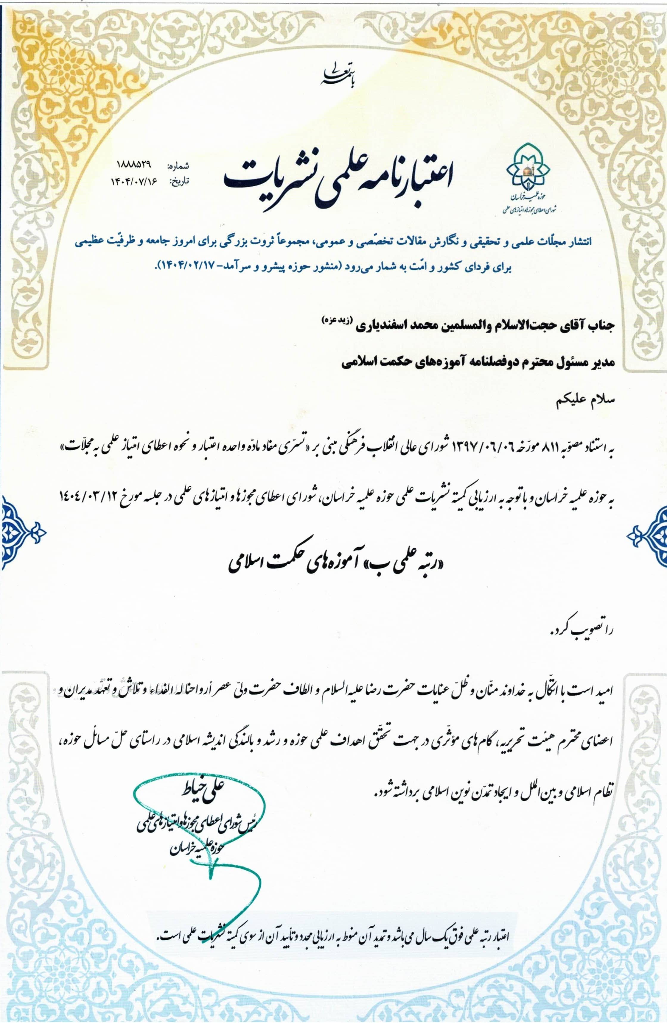 دوفصلنامه آموزه‌های حکمت اسلامی با هدف ارتقاء و توسعه علوم عقلی خصوصاً فلسفه اسلامی با رتبه علمی(ب) از شورای اعطای مجوزهای حوزه علمیه خراسان،  پذیرای مقالات ارزشمند اساتید و فضلای حوزه و دانشگاه در موضوعات زیر به صورت رایگان می‌باشد.